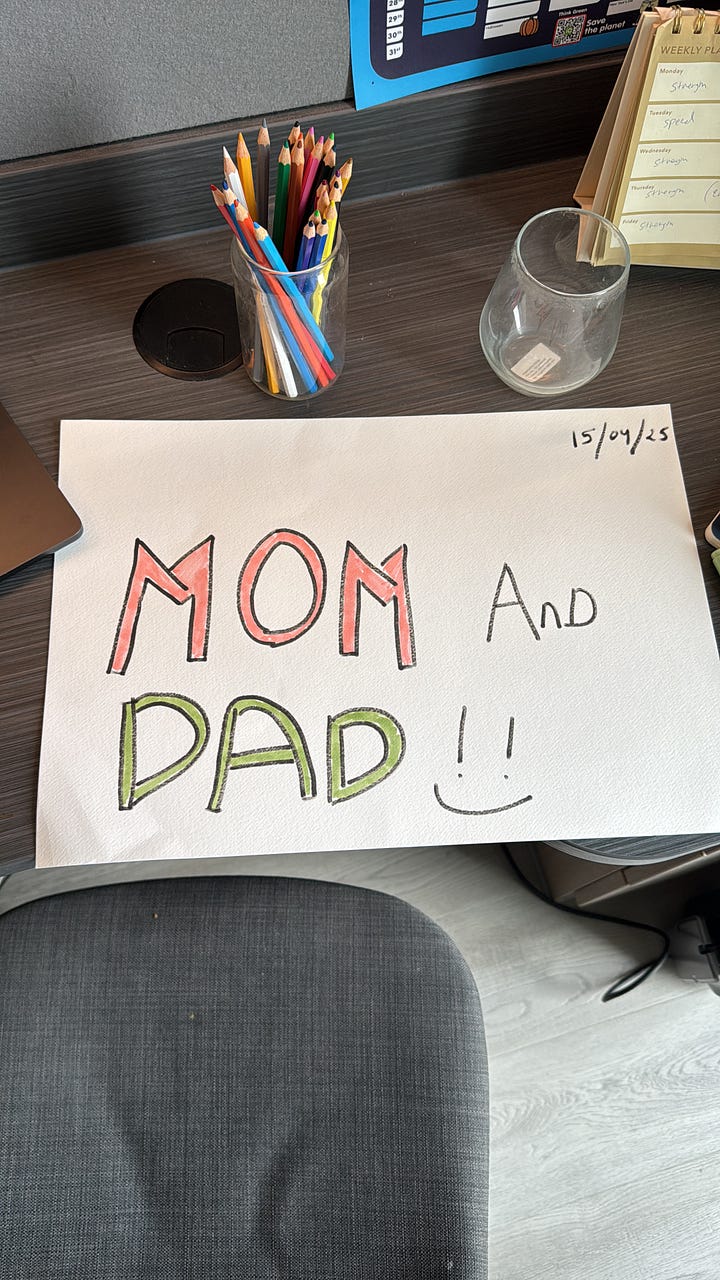 I posted all our pictures on Instagram, and I even did something I had never done before: I made a sign. When I went to pick them up at the airport, I stood there holding it, and honestly almost shed a tear when I saw them walking out.